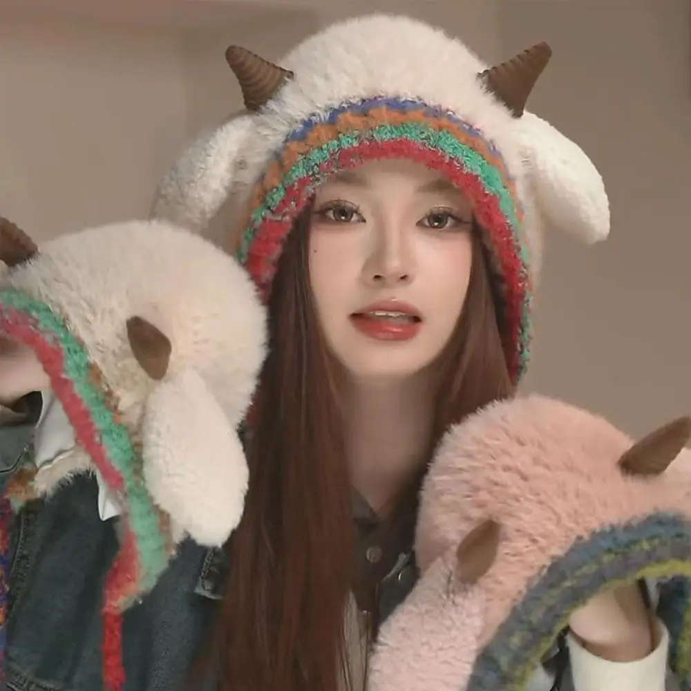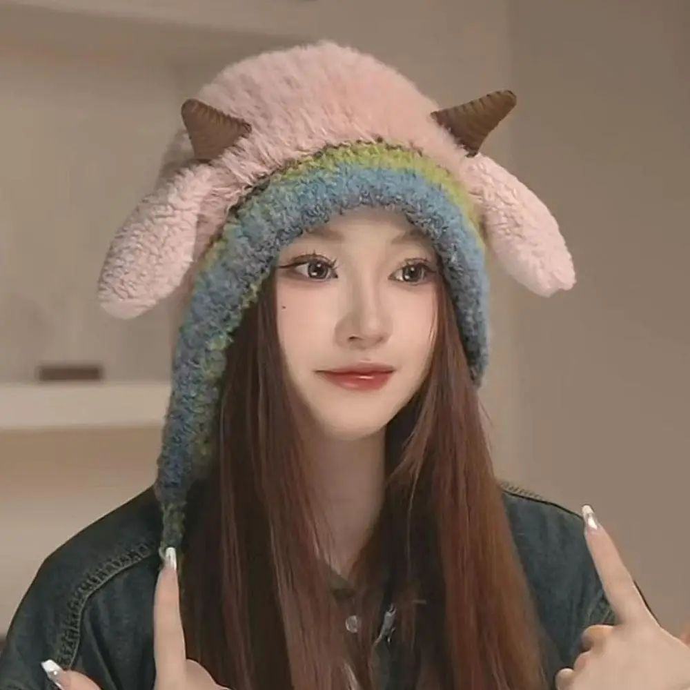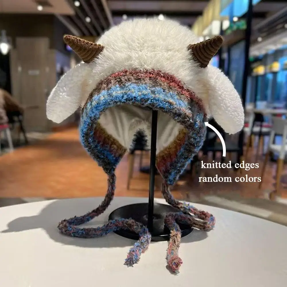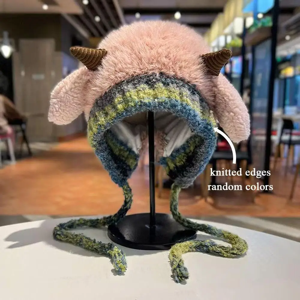 Thick Plush Knitted Hat Outdoor Lace-up Fluffy Hat Coldproof Pullover Hat Little Sheep Ear Woolen Hat Y2K Style Soft Warm DIY
